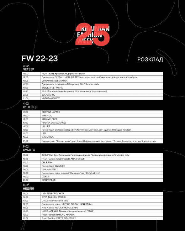 "25 лет Ukrainian Fashion Week – это не просто 25-летняя история одной компании. Это история украинских дизайнеров, которых однажды объединила наша идея сделать свою страну модной. Создать в стране новую индустрию, которая важна как для экономики страны, так и для развития ее культуры. Индустрию, представляющая Украину мира как страну талантливых людей, новых технологий, конструктивного партнерства.