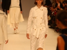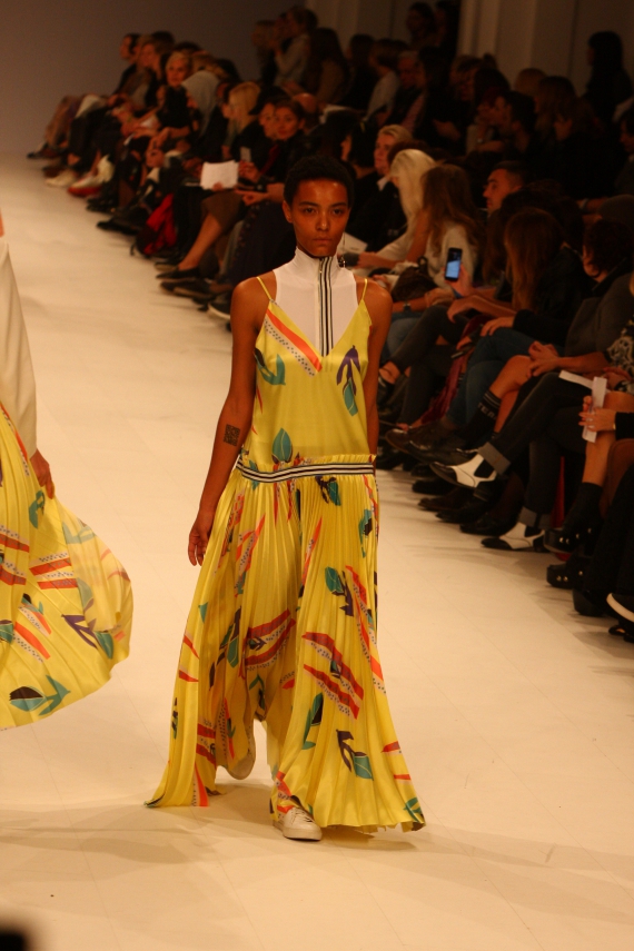 Модели вышли на подиум в легких принтованных платьях длины миди, нарядах в бельевом стиле дополненных воланами и плиссировкой. Спортивный дух можно было разглядеть на примерах олимпиек с высоким воротником. На них надели матросские жилеты с гюйсом - широкий воротник, который спадает на плечи.