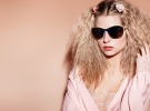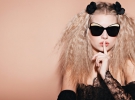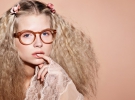 На снимках 19-летняя девушка позирует с трендовой прической. Пышные волосы с гофрированными локонами в стиле 80-ых, украшенные камелиями. Демонстрирует оправу с прозрачными линзами, круглые зеркальные или черные очки в форме бабочки с золотой отделкой. Фотосессию лично делал дизайнер Карл Лагерфельд.
