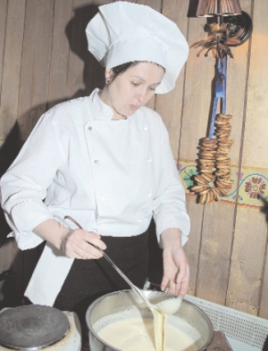 На Масленицу повар одного из столичных ресторанов 40-летняя Оксана Чубай готовит блины с творогом, а потом запекает их в духовке.