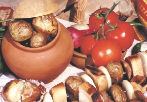 Одним из фаворитов мангала является картошка. Для ее начинки подойдут зелень, чеснок, сало и специи. Картошку нужно хорошо вымыть и разрезать вдоль, но не до конца. Чеснок и зелень измельчить, сало нарезать тонкой соломкой. Эту смесь кладем в разрез картошки, солим, перчим. Картофель раскладываем на фольгу, заворачиваем и ставим на решетку. Когда костер перегорел, кладем решетку на мангал, чтобы расстояние до угля было не меньше 10 см, и запекаем до готовности.