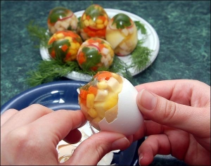 — Их же можно руками есть — не распадаются и вовсе не жирные, — пробует заливные пасхальные яйца Светлана. — Весеннее, а главное — вкусное блюдо.