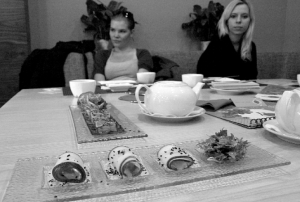 Блюдо украшает зеленым маслом. Для него укроп, петрушку, кинзу мелет в блендере. Отцеживает сок через ситечко, доливает постного масла. Выжимает масло через кулинарный шприц.