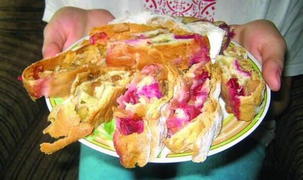 - Из этой порции выйдет два струдля. Можно ее вдвое увеличить. Тесто разделю на части. Раскатаю до толщины 1 миллиметр. На один лист выложу порезанные мелкими кубиками яблоки, прибавлю 3 столовые ложки изюма, посыплю немного сахаром. Немного корицы в порошке и кусочки масла в начинку, чтобы придавало сливочный аромат и сочнее было. Второй сделаю с яблоками и вишнями. Можно еще апельсиновую цедру, настоянную в сахаре, или апельсиновый джем. Тогда крепче вкус выходит. Струдли скручиваю в рулет и в духовку. Печется полчаса при температуре 180 градусов. Как выну, еще горячими посыплю сахарной пудрой.