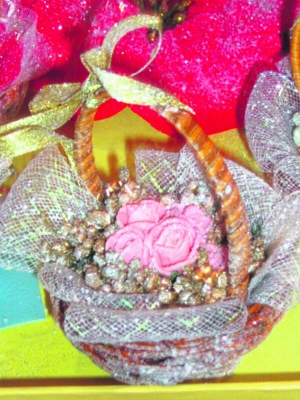 — Купила маленькие корзинки из лозы. Дно закладываю картоном. Вокруг обклеиваю лоскутками белого, розового и красного фатина. На горячий клей сажаю пластмассовые розы, вокруг них — бусины, чтобы не было свободного места. Такой клей хорошо все держит, — рассказывает. — И все это посыпаю разноцветными блестками и искусственным снегом. На ручку привязываю небольшую ленту.