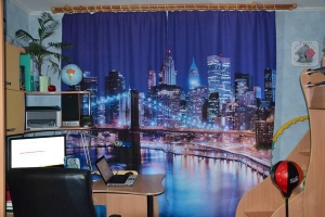 -?Комната очень большая, где-то 25 "квадратов". Служит одновременно и спальней, и гостиной. В ней было два окна, но одно мы заложили, на том месте муж повесил полочки без дверец. Стильно, но кто не зайдет в гости - заглядывает туда. Хочу прикрыть их фотошторкой. И на окно тоже такую хочу. Сначала думала с изображением ночного города, потом передумала. Ночью их все равно не видно. А днем на улице светло, а в комнате - ночной город? Сын хочет шторки со зверями. Но тоже не подходит, потому что комната станет детской.
