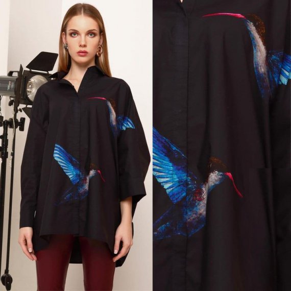 Если празднование будет в ресторане, то подойдет оверсайз рубашка с асимметричным кроем рукава и малиновым кантом. Стоит надеть к этому узкие леггинсы или брюки.