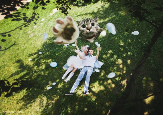 Именно поэтомусвадебный фотохудожник из Киева Василий Слюсар решил добавить в свои работы немного креатива: мужчина начал добавлять на снимки изображения разных животных. И чаще всего - любимых многими котиков.