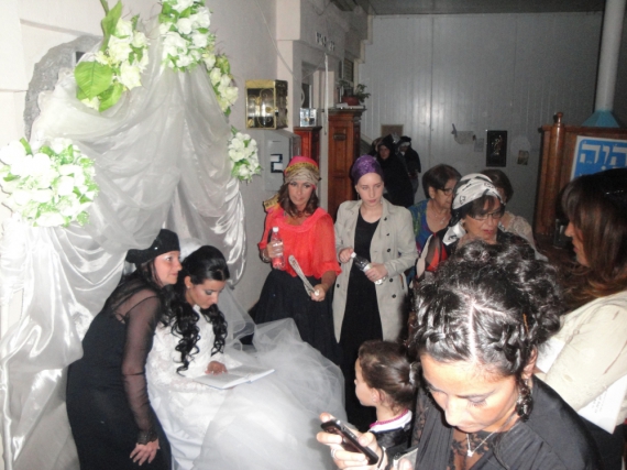 Обряд начинается сразу на двух половинах могильного комплекса - мужской и женской. Женщины, приглашенные на свадьбу, находятся вместе с невестой в женской половине. Невеста одета в белое свадебное платье, волосы аккуратно собраны и подкручены, на голове фата. Невеста стоит у могилы Раби Нахмана и читает молитвы. Рядом с ней ее мама, родственники и подруги. Женщины молятся. Неподалеку могилы белое кресло и арка с цветами. Помолившись у могилы, невеста садится под аркой и продолжает молиться. Родные невесты могут одеться как в традиционную одежду, так и в современную. Замужние женщины с покрытыми головами. Им без шарфа или платка зайти на могилу нельзя. За час невеста в окружении женщин и девушек должна выйти на улицу. Здесь обустраивают снова арку, где она садится на белый стул и снова читает молитвы из молитвенника. Здесь гости имеют возможность поздравить ее. Сюда же придет жених в окружении мужчин, чтобы взять ее в другой зал.