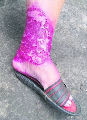 Лечится в Черкасском областном кожвендиспансере. Выходит из палаты №5 на улицу. Обе ноги опухшие, намазаны розовым раствором.