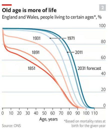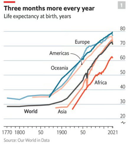 Люди в богатых странах теперь могут обоснованно предполагать, что дни их жизни продлятся намного дольше 70 лет. Жители более бедных стран догоняют их. Каждый год, начиная с 1950 года, средняя продолжительность жизни во всем мире увеличивалась на 18 недель.