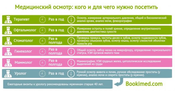 Есть ряд специалистов, которые каждый человек должен посещать раз или два раза в год. Кто эти врачи и для чего нужно проходить в них обзор, смотрите в таблице.