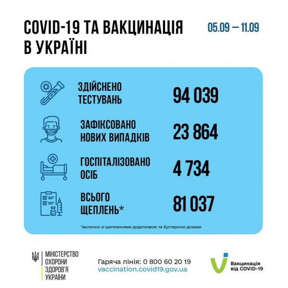 С 5 по 11 сентября зафиксировали 23 864 новых случаев коронавирусной болезни COVID-19. Об этом сообщило Министерство здравоохранения.