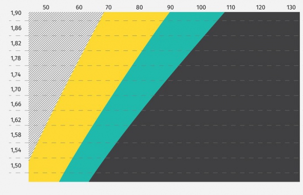 Индекс массы тела определяют по соотношению веса человека к его росту. Какой ВМІ является здоровым для вашего организма, можно узнать из следующего графика. На нем желтым обозначено норму, прозрачным штрих-кодом - заниженный вес, зеленым - избыточный вес и серым - ожирение.