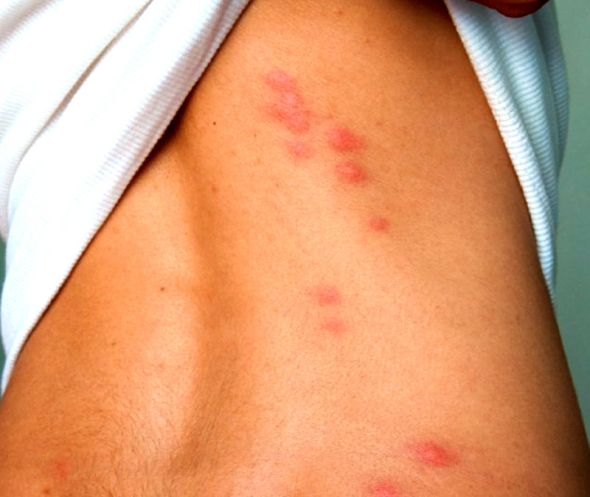 Укусы клопов оставляют на коже зудящие пузырьки, которые обычно расположены в ряд по трое или больше. Чаще они возникают на участке, контактирующем с постелью.