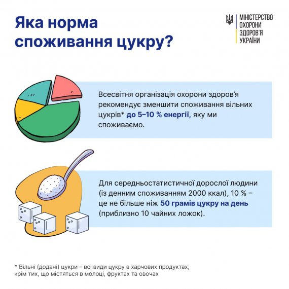 Всемирная организация здравоохранения рекомендует уменьшить потребление свободных сахаров (все виды сахара в пищевых продуктах, кроме тех, которые содержатся в молоке, фруктах и овощах) до 5-10%.