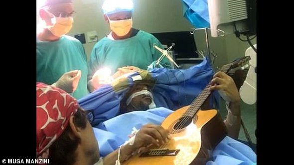 Музыканту Мусе Манзини из Южно-Африканской Республики провели необычную операцию по удалению опухоли головного мозга. Врачи сделали мужчине трепанацию черепа, подключили к мозгу электроды и попросили пациента сыграть на гитаре. За счет этого медики получили возможность удалить опухоль, избежав повреждений.