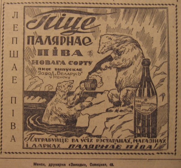 В городе можно было увидеть рекламу нового сорта пива "Полярное". На этикетку белорусского пива каким-то образом попали два белых медведя. В середине 1930-х первые белорусскоязычные школьники раз заканчивали школу. Они вместе со всеми гражданами СССР переживали за экипаж парохода "Челюскин", который застрял во льду дальнего Чукотского моря. Это событие в Минске также увековечили в названии парка культуры и отдыха, который разбили на месте Комаровского леса. Лишь в конце 1980-х в Парке Челюскинцев были найдены остатки расстрелянных НКВД белорусских интеллигентов.