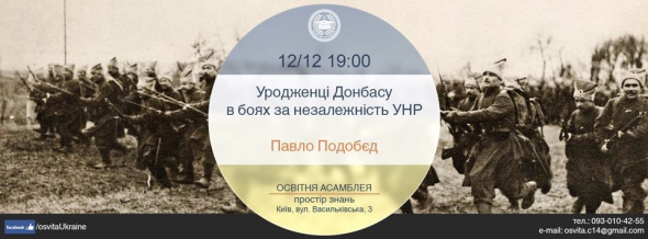 12 декабря в "Образовательный ассамблеи" состоится лекция "Уроженцы Донбасса в боях за независимость УНР". Встречу проведет историк, руководитель благотворительного фонда "Героїка" Павел Подобед.