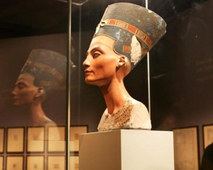Скульптурный портрет Нефертити, жены фараона-реформатора Эхнатона (14 в. До н. Э), изготовленный из известняка и полностью окрашен. Эксперты высказывают предположение, что бюст был создан еще при жизни царицы. На это указывает то, что в изображение Нефертити инкрустирован только один глаз: второй глаз, по обычаю, статуи должны были вставить лишь после смерти прообраза и таким образом вселить в нее душу умершего.