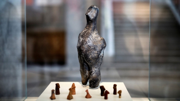 Гранитная скульптура высотой 36 см. Ее выставили вместе с другими типовми образцами неолитической скульптуры из глины и мягкого камня.