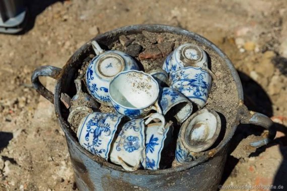 В Дрездене немецкие археологи раскопали подвал-бомбоубежище, принадлежавший кафе "Зоммер". Нашли полки, наполненные бутылками с вином, и горы уцелевшего посуды Майсена - самого ценного фарфора Европы.