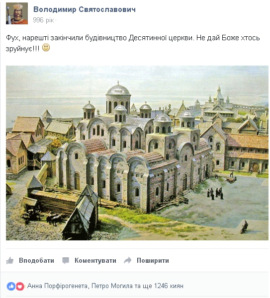 Отписывали "на стене Украины" и тогдашние правители. В 996 году Владимир Святославович написал пост: "Фух, наконец закончили строительство Десятинной церкви. Не дай Бог кто-то разрушит".
