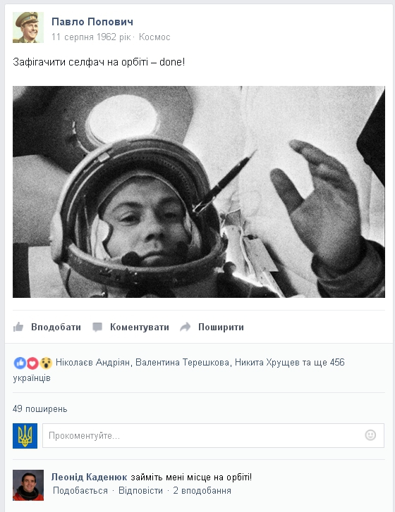 11 августа 1962 советский космонавт Павел Попович поделился селфи с орбиты. В посте, местонахождение указано как космос.