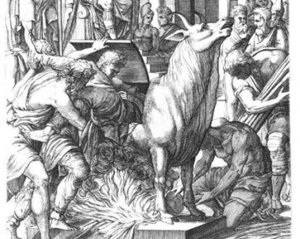 Это была бронзовая фигура быка. пустая внутри. на стороне бык имел двери. Через них внутрь фигуры запихивали человека. под животом быка разводили огонь. жертва медленно умирала внутри.