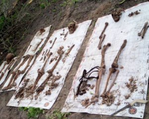 "Женщина сообщила, что у нее в огороде похоронены бойцы, расстрелянные немцами в сентябре 1941 года. Прибор ничего не показал, щупом не дотянулись, но, когда упорный Юра Мельников заставил всех дошурфить на два метра, пошли останки. Вскрытие показало, что тела были засыпаны известью. Она полностью разъела мелкие кости, остались практически только ноги и фрагменты черепов. Головы развалены - добивали "контрольным". Из амуниции - обрывки кожаных ремней и куски черной шинели", - сообщает Союз поисковых отрядов Украины.