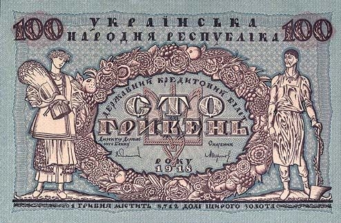 Среди гривен, введенных в оборот в октябре 1918-го, были и банкноты номиналом 100 грн. Этот шедевр Георгия Нарбута по красоте и совершенству доныне не имеет равных. Женщина со снопом лицом будто напоминает Лесю Украинку, а кузнец похож на Григория Сковороду.