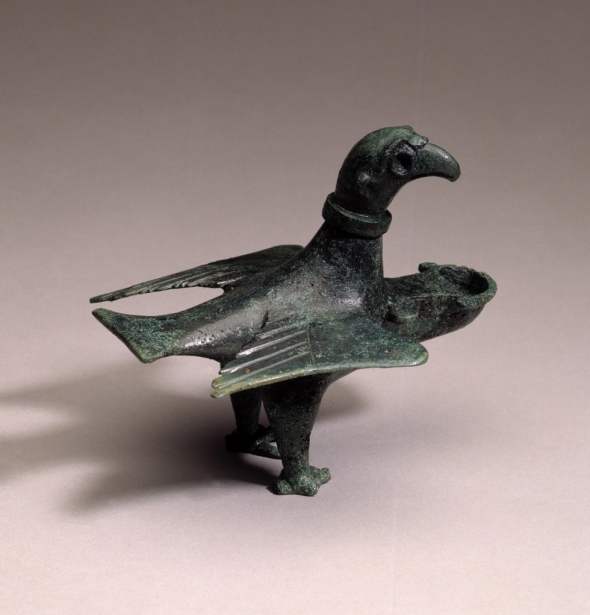 С лицевой части лампы имеется продолжение с углублением для масла. Поверхность фигурки покрыта многочисленными порами, — доказательства литья модели. Голова орла была отлита отдельно и легко снимается, позволяя залить масло внутрь. К сожалению, время не пощадило птицу, у фигурки утеряны глаза.