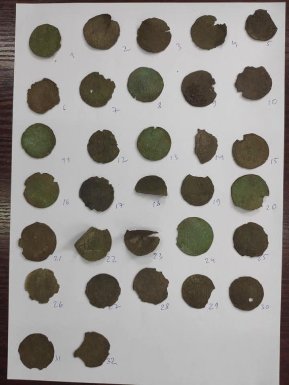 Обнаружили 32 монеты. Они датируются 1000-1019 годами. На монетах изображены трезубец Владимира и двузубец Святополка.