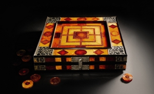 В пользу столь аристократичного происхождения этой игры свидетельствует исключительное качество его исполнения. Великолепная, выполненная в классическом стиле рельефная резьба, использование светлого янтаря, просвечивающего из-под полупрозрачного красного янтаря – все это типично для лучших образцов подобных изделий из Кенингсберга. Это изделие остается одним из самых изысканных янтарных произведений 17 века, дошедших до наших дней.