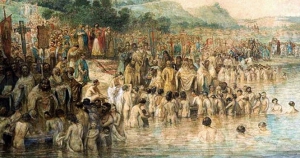 Что же касается картины крещения — ее точно установить невозможно. Например, никто, даже археологи, точно не знает, сколько людей тогда обитало в Киеве, какой была структура населения. Есть приблизительные подсчеты только для более позднего времени. Фантазировать же можно сколько угодно. Например, хронист 16 века Матвей Стрийковский писал, что священники стояли на мостиках над рекой и оттуда обрызгивали людей.