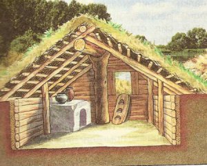 В IX-X в. углубленное славянское жилище хотя и не было архитектурным шедевром, но уже имело свое рациональное планирование. Это было сооружение подквадратной формы, размерами 2,8×2,8 м и 3,2×3,2 м, двускатную крышу которого покрывали камышом или соломой. Тогда еще потолка не было. Для того, чтобы из жилища "не убегало" тепло, его наземную часть окружали валикообразной насыпью земли.