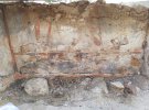 "Изучение строения привело к обнаружению сохраненного слоя фресок на стенах храма, - рассказывают археологи. - Фрагменты фресок являются частями расписной драпировки, а также сценой с фигурами святого воинства, которая сохранилась частично - только ноги. Площадь сохранившихся фресок составляет около 12 кв. м".