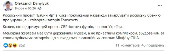 "Русский проект "Бабий Яр" в Киеве призван навсегда запечатлеть российскую ложь об украинцах - соорганизаторах Холокоста. Каждый, кто поддерживает этот проект СВР-овских фунтов, - враг Украины.