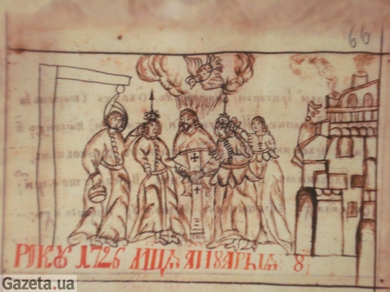 "Самая интересная миниатюра - бракосочетание в городке Куземин, Гадячского полка. Изображено, как священник дает брак - летит Святой дух в виде голубя, стоят молодые. А какой-то человек, который уже испытал сладости брака, дорисовал виселицу и петлю, которая затягивается на горле жениха", - рассказала Путовая.