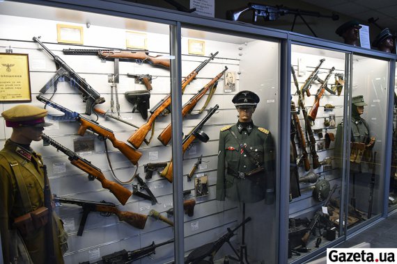 Из стрелкового оружия здесь представлено почти все, которое использовали на восточном фронте Первой и Второй мировых войн. Аккуратно изложены и более современные автоматы, пулеметы и снайперские винтовки, которыми до сих пор воюют на Донбассе. Также бронежилеты и каски с Майдана. Еще есть трофеи, взятые у "Беркута" и российских боевиков на Донбассе.