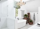 5. Добавить живых растений. Можно поставить горшки с цветами на пол или подоконник. Если места не много, подвесить их к потолку. Живые растения помогут разбавить цветовую палитру комнаты, добавят в интерьер индивидуальности. Лучше всего подойдут алоэ, бамбук, бегония, орхидея, драцена, "женское счастье", плющ, диффенбахия, филодендрон – все они хорошо будут чувствовать себя в условиях повышенной влажности, имеющихся в ванной. Как вариант, можно поставить в вазу букет цветов.
