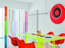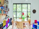 Большое значение в создании интерьера сыграли солнечные лучи, падающие сквозь широкие окна дома. На месте кухни на первом этаже художники разместили библиотеку. Ее украшает раздвижная стеклянная стена, а кухня расположена этажом выше, с плавным переходом в столовую и зал. В столовой свет из стеклянной стены "ловит цвет" и отражается розовым, оранжевым, голубым и зеленым. Далее свет падает на флуоресцентный желтый стол.