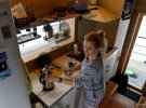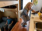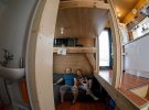 С порога открывается маленькую прихожую, ступенькой вниз - гостиная, а на две ступеньки вверх - кухня. Под потолком жители спят, а под кухней находится кладовая высотой в метр.