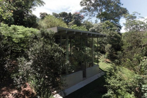 Бразильская архитектурная компания Atelier Branco Arquitetura построила в тропическом лесу уединенный дом. Для строительства выбрали наклонную местность со ступенчатым рельефом. Это позволило разместить дом в низине и обеспечить свободный доступ на крышу, где обустроили открытую террасу. От традиционного парапета, который должен бы защищать кровлю, отказались. Вместо него по периметру крыши сделали водяные "клумбы".