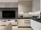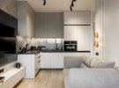 В кухне-гостиной они добавили правильные акценты в виде полос на стене, рифленой стеновой панели с ТВ. Также отчетливо вигялажають графитовая кухонная столешница и терракотовые обеденные стулья.