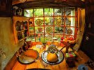 Внутри сказочной тематике соответствует каждая часть интерьер. Низкие потолки и деревянная отделка создает впечатление, что жилье действительно находится под землей.