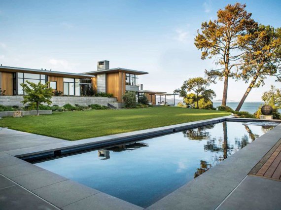 Этот потрясающий современный дом с видом на бухту разработали как энергоэффективный. Смелая архитектура сочетается с естественной палитрой материалов.