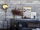 Стена гостиной создана с известняка, в то время как наверху драматическая серая бетонная стена является доминирующей чертой камина модерна. Акценты декора на всем протяжении подчеркивают правильную ноту блеска в отличие от более темных оттенков комнаты.