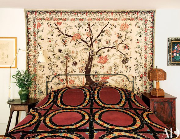 3. Украсьте текстильными изделиями. Самый простой вариант — так называемый ковер-картина. Можно также собственноручно создать декоративную композицию из старых шарфов либо других тканевых изделий.
