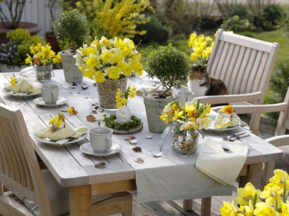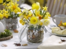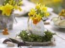 Дополняют композицию с нарциссами другие растения - желтые тюльпаны, белые фиалки и даже зеленый мох. Из крупных цветов изготавливают подсвечники и солонки.